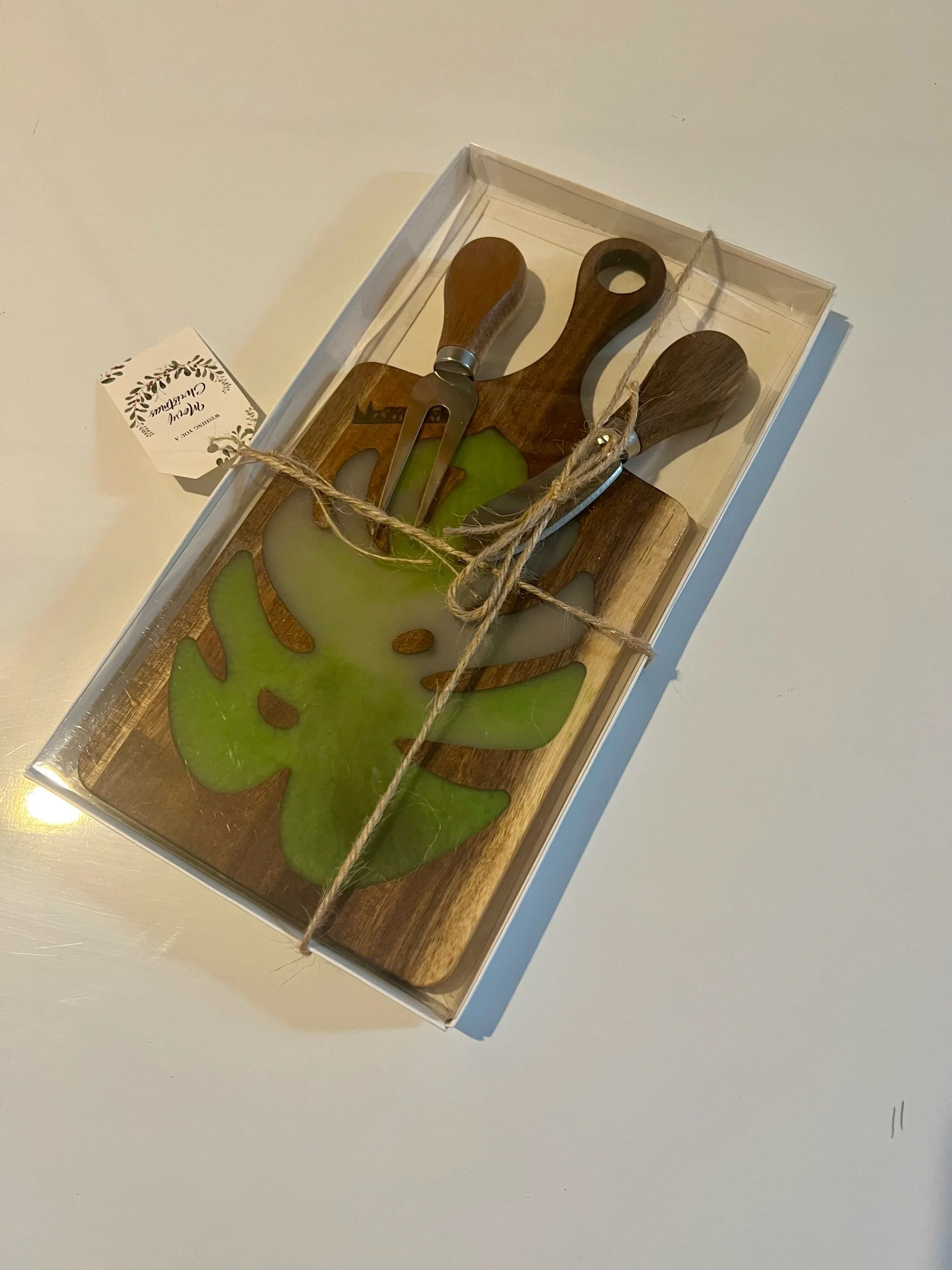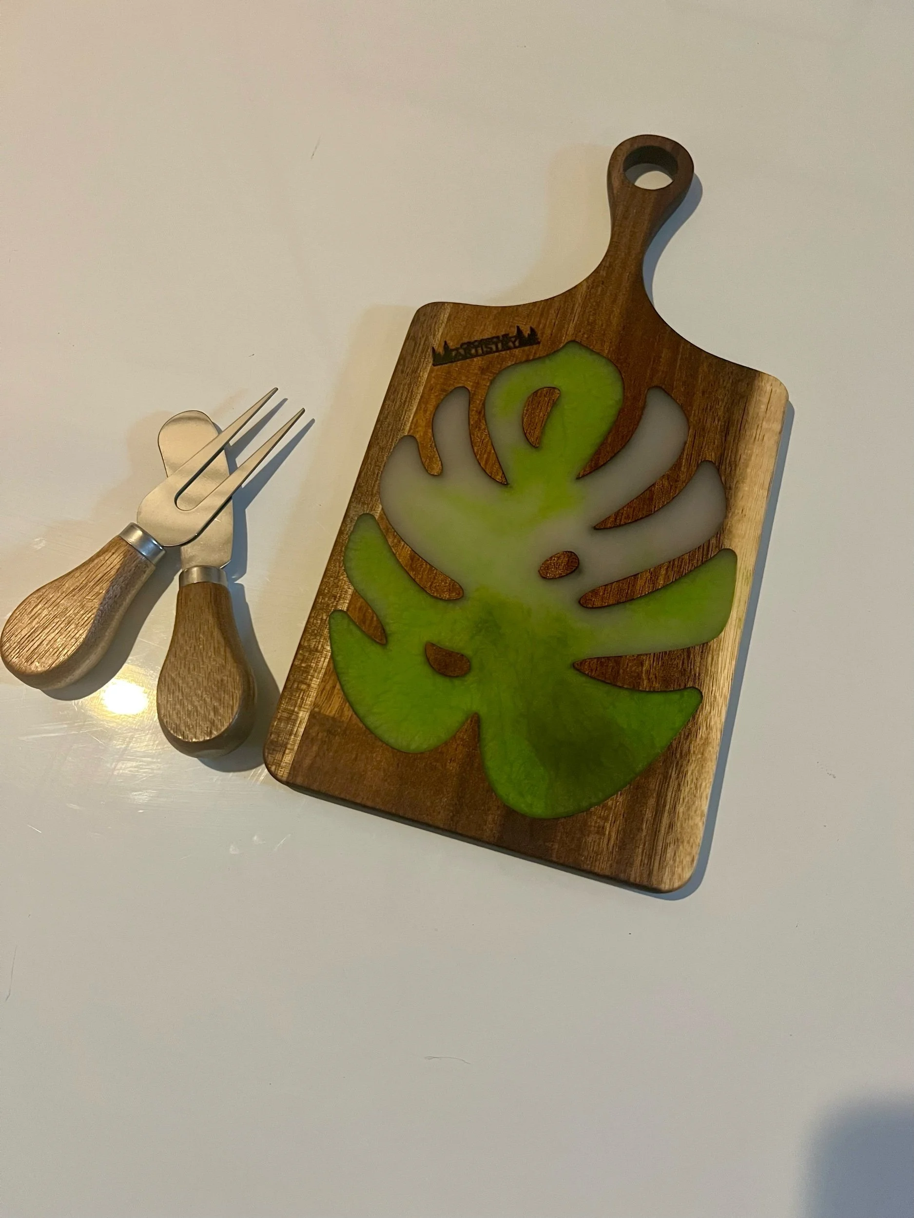 These handmade acacia wood mini cheese boards feature an inlaid resin monstera leaf, available in three colors — green, white, or copper. Each board is finished with a smooth, food-safe oil that keeps the natural acacia grain glowing.